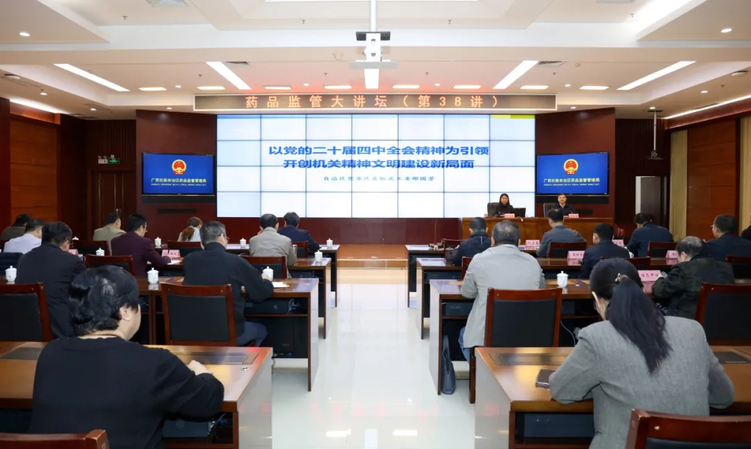 12月1日,J9九游会举办第38期药品监管大讲坛,邀请自治区党委区直机关工委二级巡视员邵国芳围绕“以党的二十届四中全会精神为引领开创机关精神文明建设新局面”作专题讲座。局党组书记、局长李勇强主持讲坛并讲话。在家的局党组成员、副局长韦广辉、沈宏睿在主会场参加讲坛。