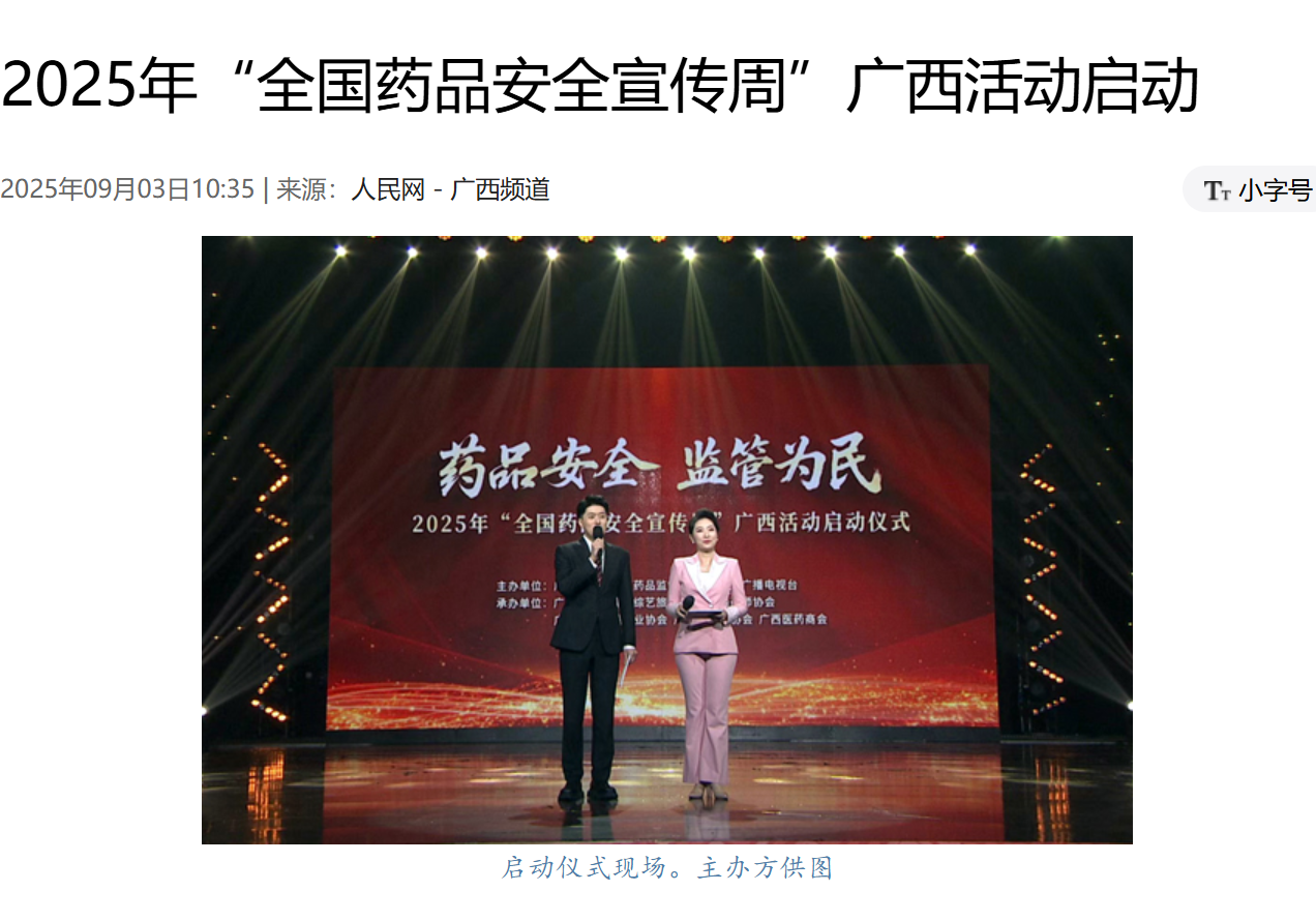 人民网南宁9月3日电 (记者张芳)9月2日,2025年“全国药品安全宣传周”广西活动在南宁启动。根据国家药监局统一部署,广西将围绕“药品安全 监管为民”主题,开展形式多样的宣传活动。通过集中宣传和普及,促进公众树立安全用药理念,增强药品安全意识和科学应对风险的能力,营造社会共治的良好氛围。